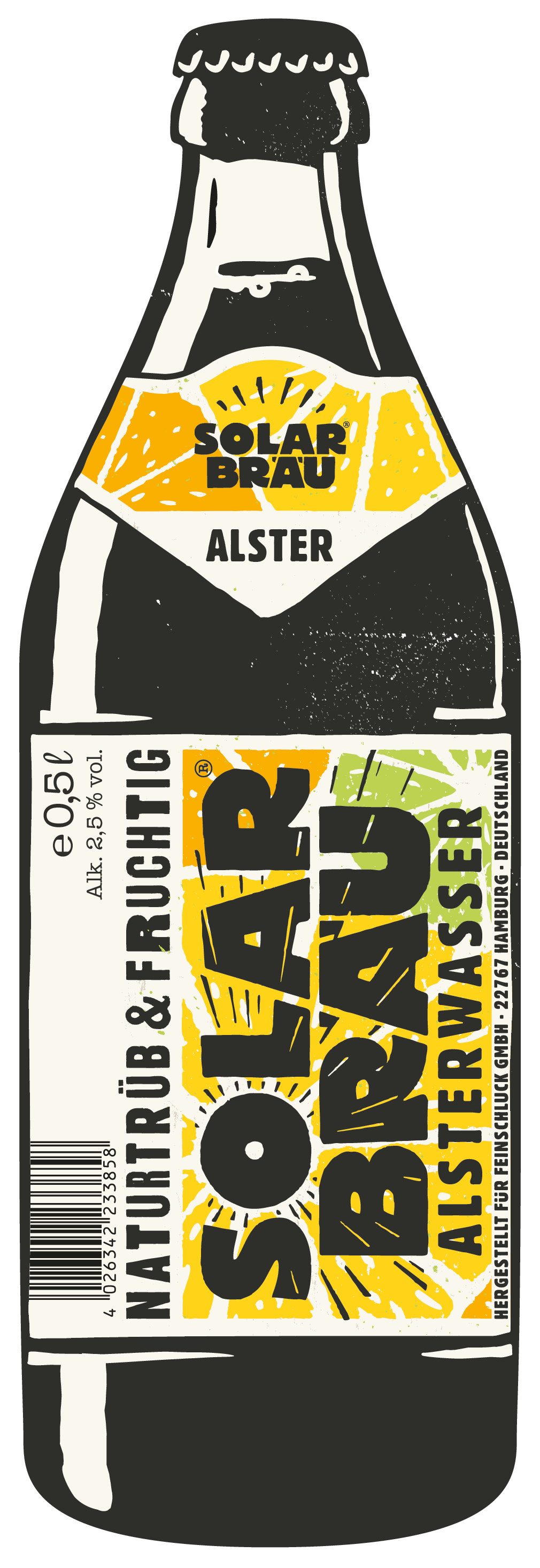 Ein naturtrübes Biermischgetränk aus 50 % Solarbräu Helles (klimaneutral gebraut) und 50 % Erfrischungsgetränk Zitrone. Fruchtig mit Orangensaft und einem Spritzer Limettensaft verfeinert.